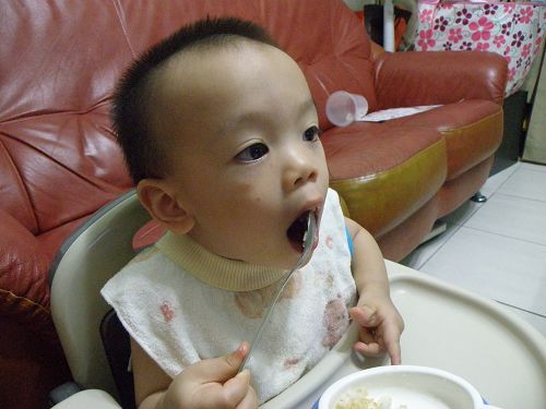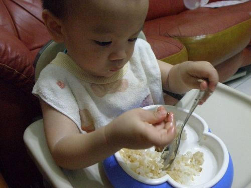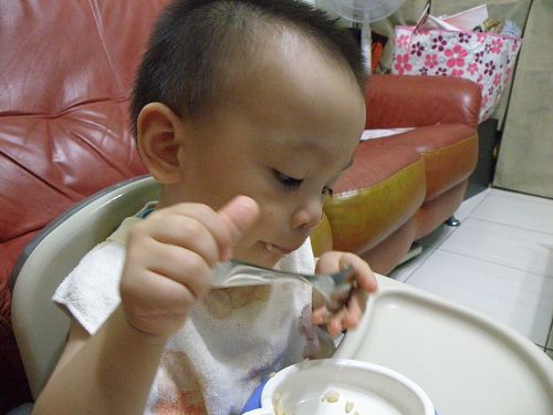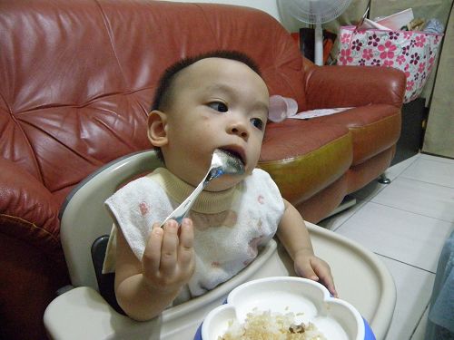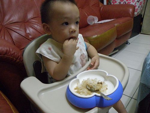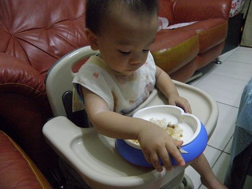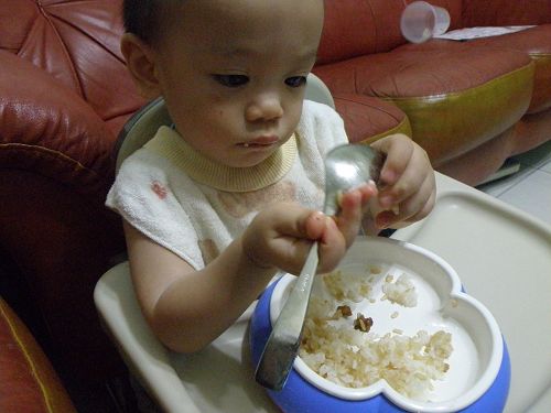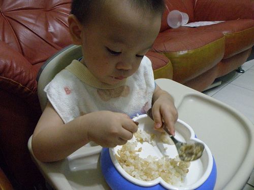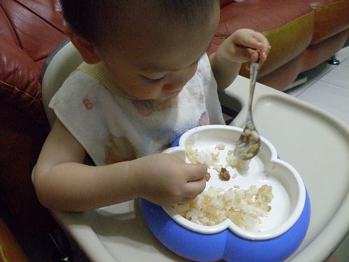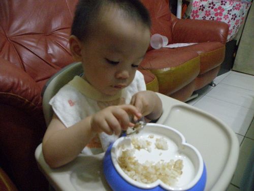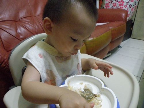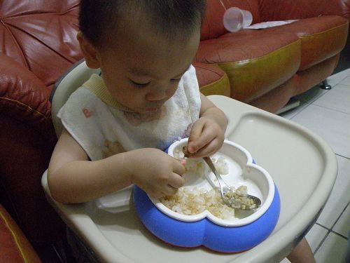 ↑看他要舀飯真想幫他裝一裝再讓他自己送嘴巴...可是我要忍住 ![]()