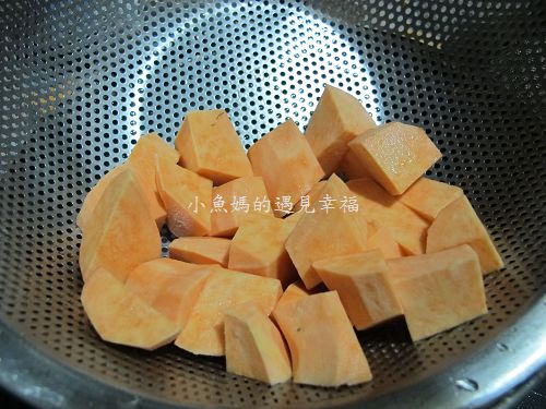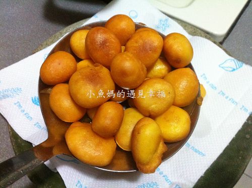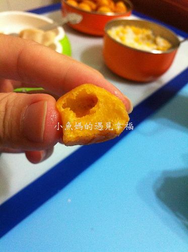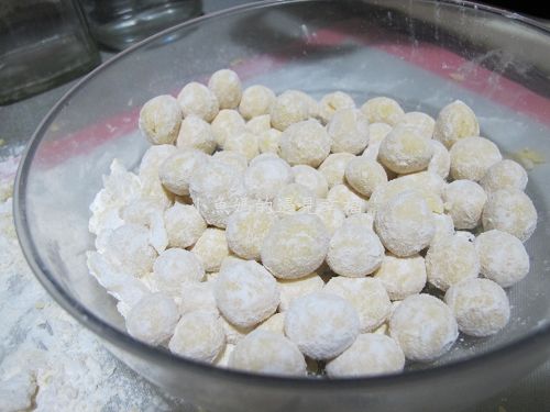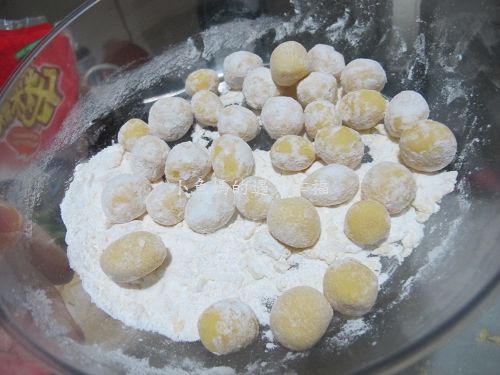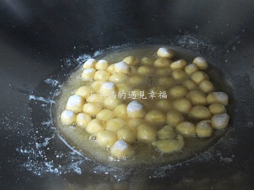 ↑容器上放一些糯米粉讓地瓜球不會感情太好年一起